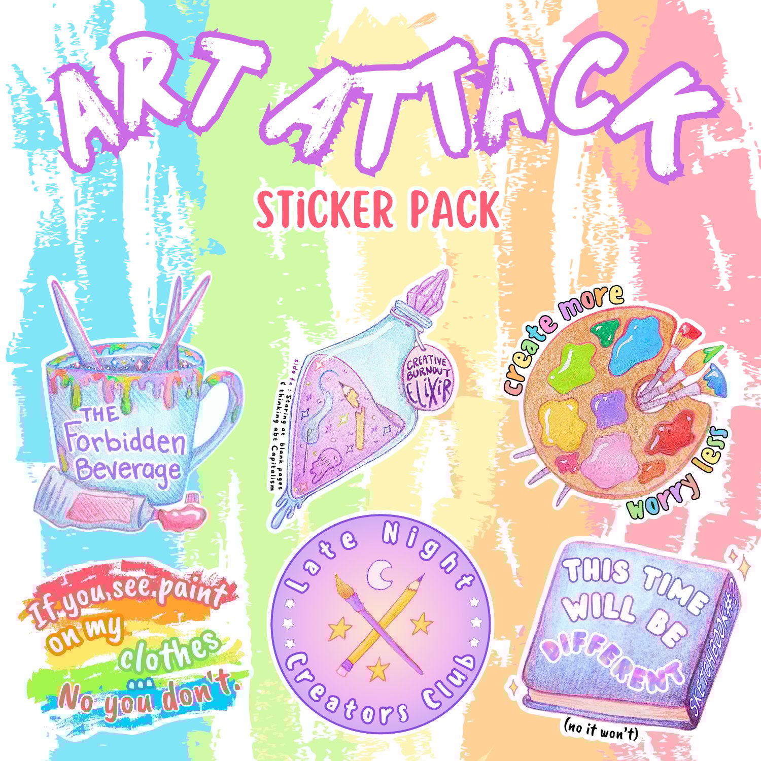 This pack is for every creator who’s ever confused their paint water with coffee, declared “this sketchbook will be different,” or found themselves suddenly productive at 2AM. Equal parts unhinged and inspired, this set celebrates the beautifully messy reality of making art.